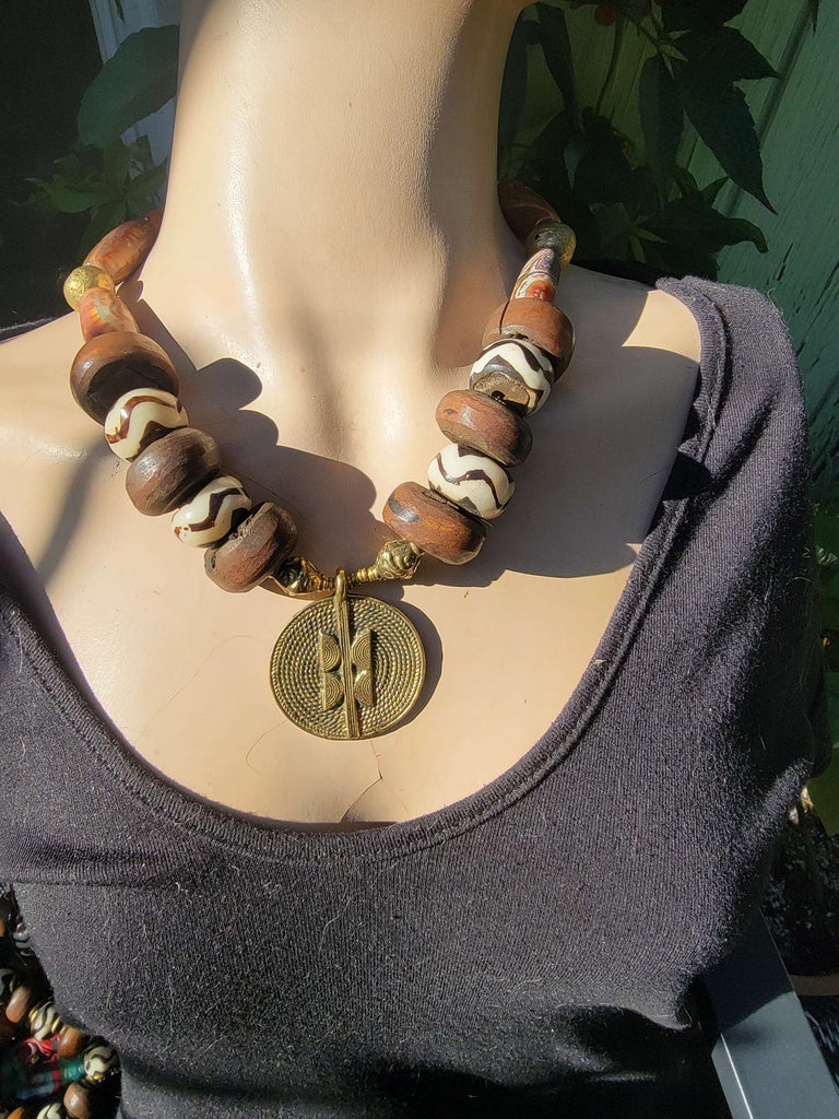 A brass disc hangs from wooden Afican beads topped with powerful Tibetan polished agate beads. The effect is mesmerizing. Wear with separate choker and have a unique, stunning ensemble. Pendant necklace is 21 inches. Handmade in Southampton by Aimee.